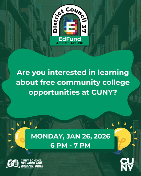 If you are between the ages of 25 and 55, you may be eligible to attend CUNY and earn a degree at no cost. The DC 37 Education Fund and the CUNY School of Labor and Urban Studies are hosting a virtual information session on Monday, January 26, to discuss program eligibility, participating schools, and covered degree programs.