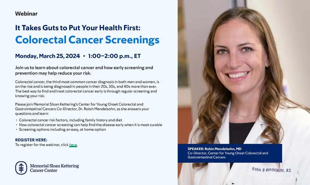 Did you know colorectal cancer is the third most common cancer diagnosis among men and women? Join MSK for Colorectal Cancer Screenings, a webinar dedicated to the role early screenings play in detection and prevention. We will be joined by guest speaker Robin Mendelsohn, MD, as she answers your questions about risk factors, early detection, and screening options. We hope to see you there!